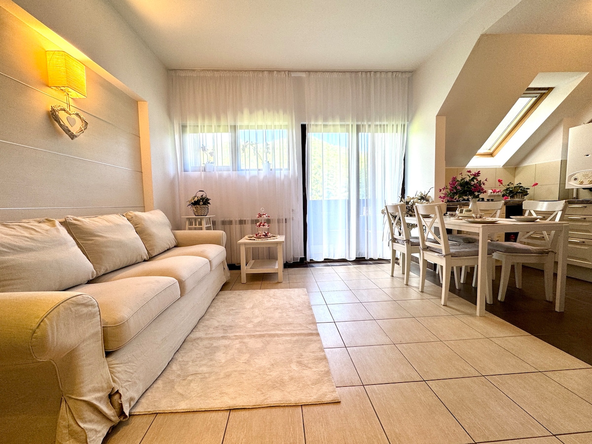 🏡 Modern apartment, perfect for up to 4 guests 🛏️ Separate bedroom + sofa bed in the living room 🍳 Fully equipped kitchen 🌳 Private garden with stunning view 🚗 Free parking ❄️ Air conditioning 📶 Fast WiFi ❤️ Cozy home-away-from-home vibe – always happy to welcome you back! Book your stay now and experience comfort, privacy and all the amenities you need for a memorable visit. We are ready to make your trip easy and enjoyable - just bring your suitcase and relax!