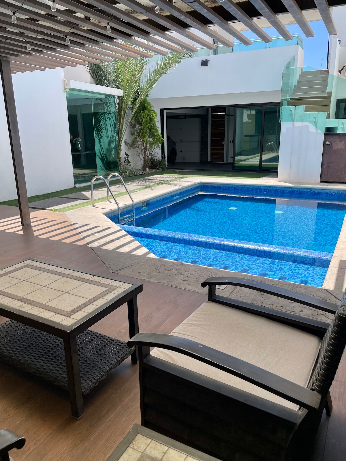 Conoce nuestra lujosa casa con alberca y terraza privadas. Amplía casa con 3 recámaras con su propio baño en cada una. Totalmente amueblada y refrigerada, con cochera para 4 autos y alberca y terraza privadas. También tenemos la opción de renta para eventos con costo extra. En la planta baja encontrarás nuestra amplia alberca junto con un espacio para preparar en el asador y medio baño. En la planta alta encontrarás nuestras tres recámaras, dos camas king y una matrimonial c/u con su baño