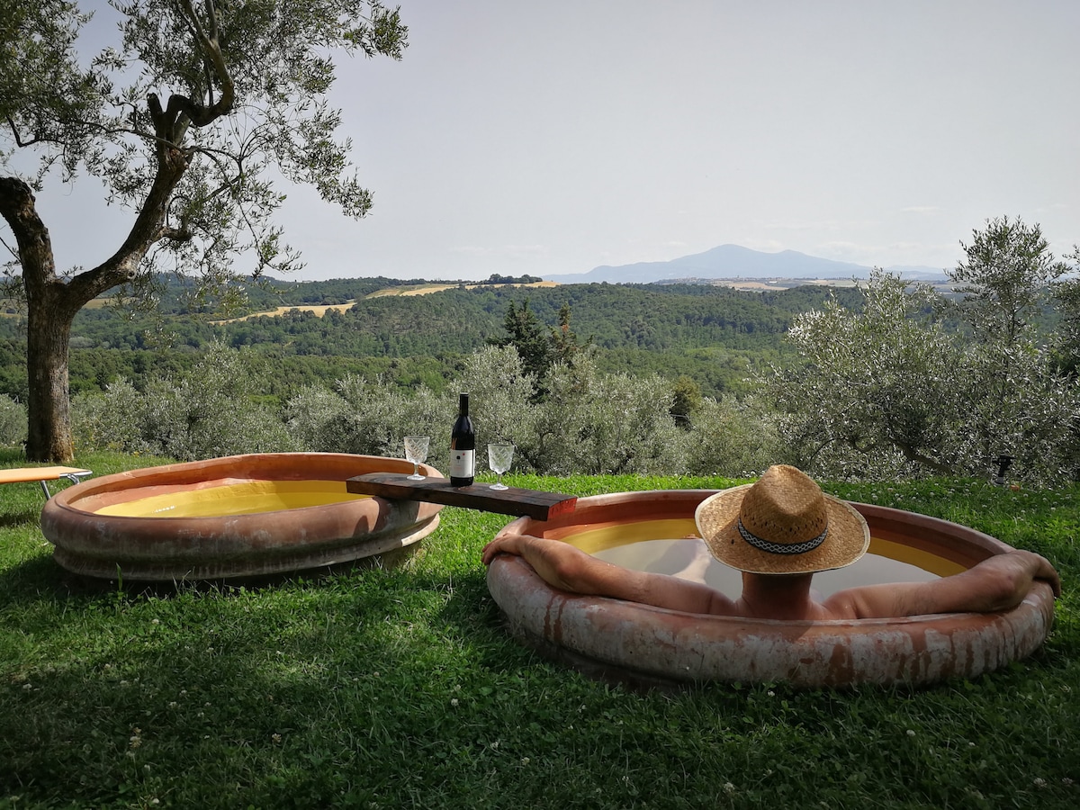 Apartment with beamed ceilings and terracotta floors, this apartment is set in a 19th-century farmhouse located in the hills of Siena in Rigomagno Toscana. From the solarium next to the swimming pool in the middle of the olive trees, you can admire the panorama of the Sienese hills and the medieval village of Rigomagno ... all this characterizes the ideal holiday for couples or families who want to relax. Solarium, garden, terrace, swimming pool are exclusively for guests of the apartment.