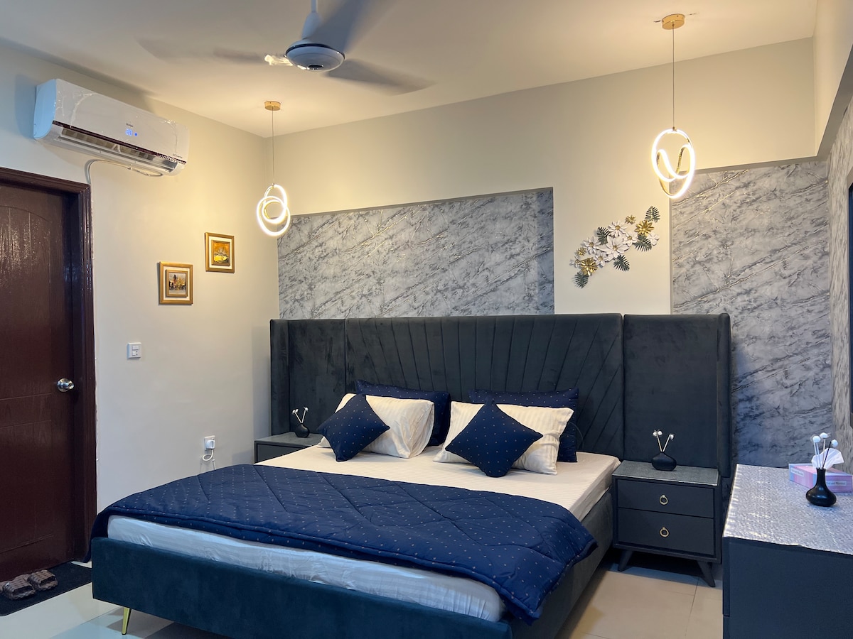 Unwind with Your Family in Our Serene 3-Bed Apartment Escape to our cozy 3-bedroom apartment. - 3 Spacious Bedrooms: 2 master bedrooms with king-sized beds, AC, and smart TVs. One room has a stylish dressing area, third room has single bed, cupboards, Iron stand, dressing table & no Ac. - Amenities: Attached washrooms, 3 shaded LED lighting. - Drawing Room: 5-seater sofa, attached washroom. - Kitchen: Spacious American-style with dining table and brand-new appliances. Unit on 2 floor no lift