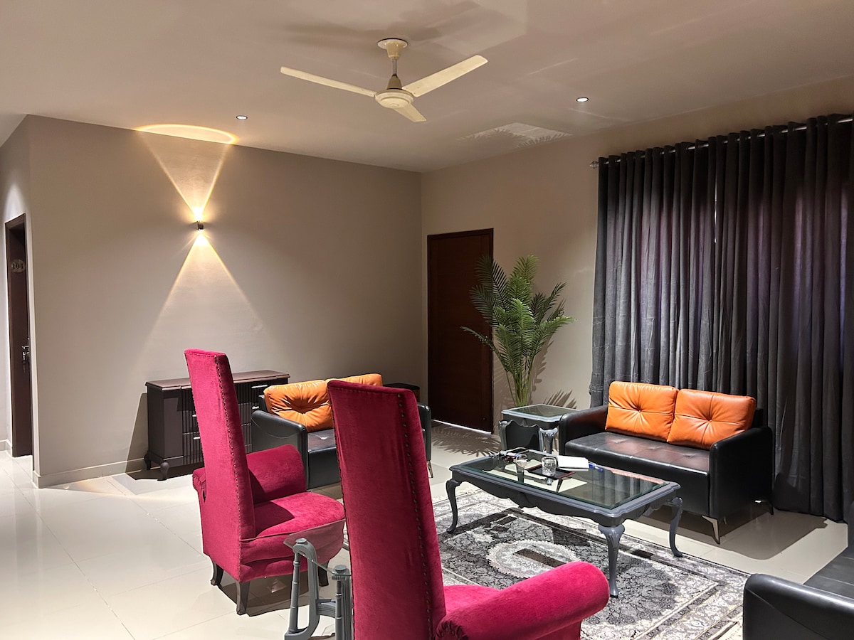 it's whole entire double story banglow 4 bedrooms with kitchen and lounge independent house. cleaning service available through out stay alternative days my servants come and clean , groceries home delivery available Relax with the whole family at this peaceful place to stay. Welcom serene room in a stylish DHA house! Offering modern comforts and a peaceful ambiance, it's your perfect escape. Sink into plush bedding, enjoy natural light through large windows, and relax in the cozy seating area