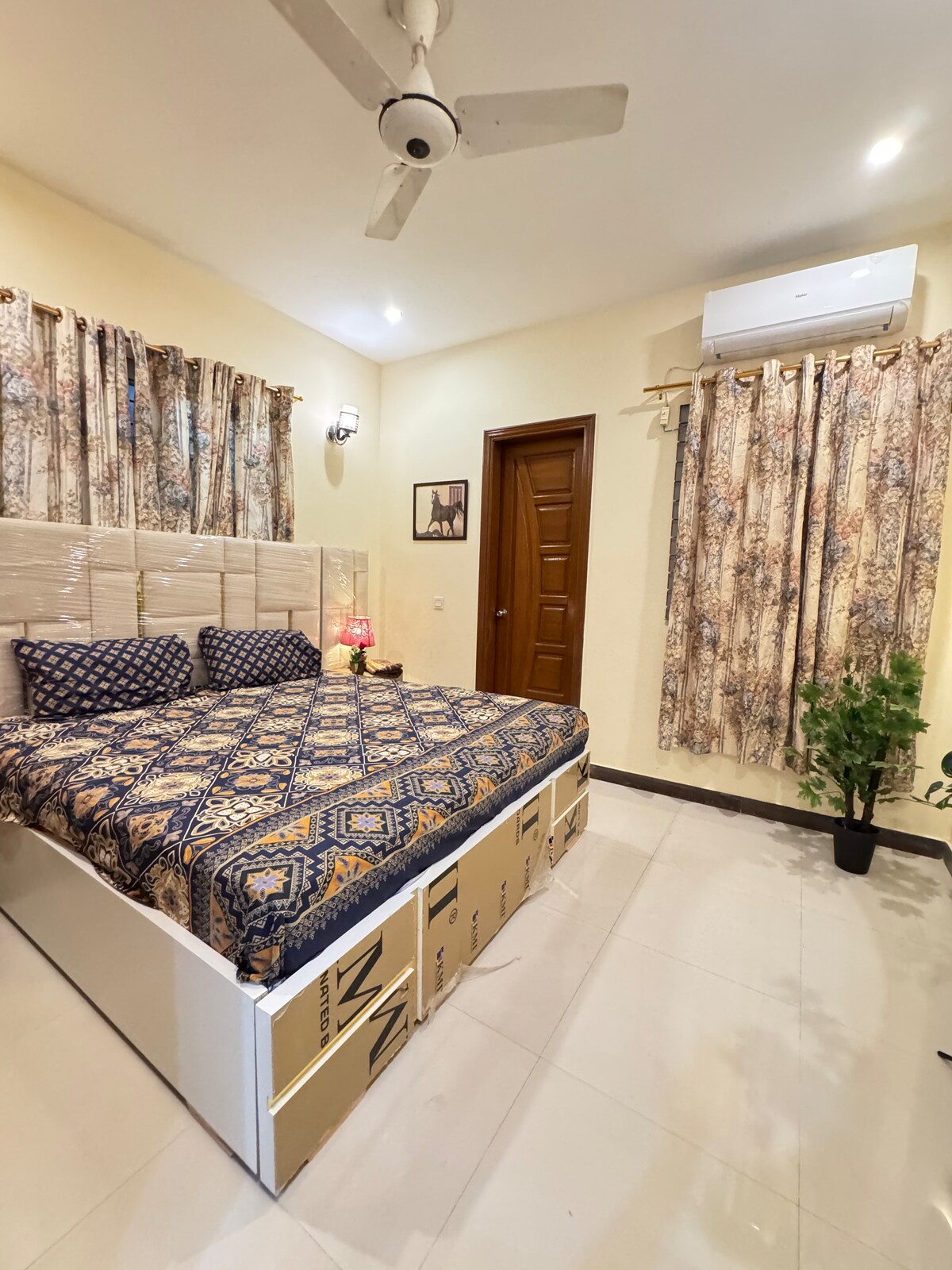 it's whole entire ground floor 3 bedrooms with kitchen and lounge independent house. Car parking inside.servqnt quarter available cleaning service available through out stay alternative days my servants come and clean , groceries home delivery available Relax with the whole family at this peaceful place to stay. Welcom serene room in a stylish DHA house! Offering modern comforts and a peaceful ambiance, it's your perfect escape. Sink into plush bedding, enjoy natural light