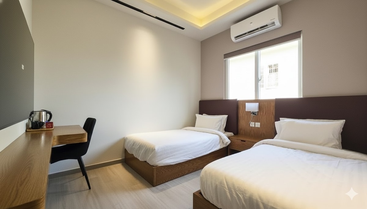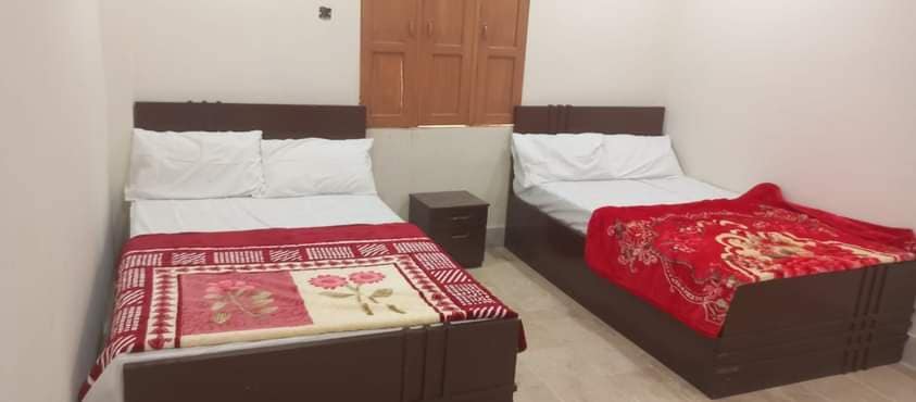This comfortable double-bed room is ideal for 2-3 guests, offering all the essentials for a relaxing stay at 24-7 Hotel. Hotel Amenities: 24/7 access to the gym Room service Secure parking Nearby food spots, barbershops, marts, and hospitals Breakfast available for 1,000 rupees for 2 guests Extra mattresses available (additional charge) House Rules: No smoking No unmarried couples allowed No alcohol Enjoy your stay in the heart of the city with everything you need just steps away!