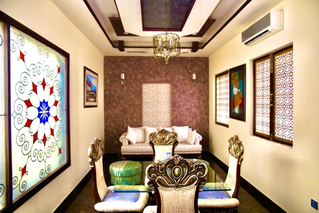 Fully furnished with designer furniture; fancy curtains; tastefully designed bathrooms with designer vanities, Grohe sanitary, Rocca washbasin and jacuzzis; Spanish tiles; carved wooden doors; fancy chandeliers; tasteful paintings; Beautiful ceilings details; Niches with spot lights and designs;