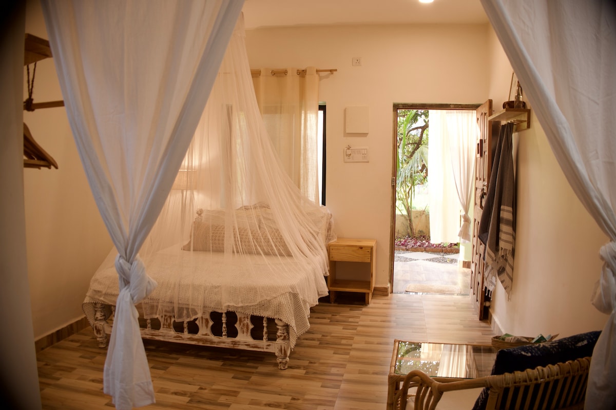 The cottage is simple, clean, and designed for comfort. The bedroom has a comfortable double bed with fresh linens, warm lighting, and charging points on both sides. Minimalist interiors with natural textures and a rustic Goan tiled roof add local charm. The bathroom is clean, functional, and well maintained, with a shower and essential amenities. This is a no-frills, nature-focused stay—ideal for guests who value cleanliness, comfort, and authenticity over luxury.