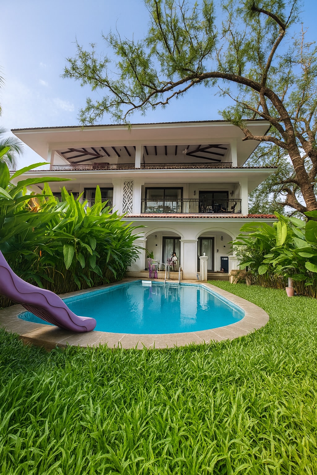 "Sunsaara Poolside Villa” Exquisite, Elegant sun-drenched & east-facing. The spacious living area exudes an air of exclusivity, with plush furnishings and tasteful décor that seamlessly blend comfort and style. Pristine crystal-clear pool is surrounded by a lush green lawn. When the sun sets, the villa transforms into a haven of romance. The villa's east-facing orientation means you'll have a front-row seat to the stunning sunrise each morning and the moonrise at night with a candlelight dinner.