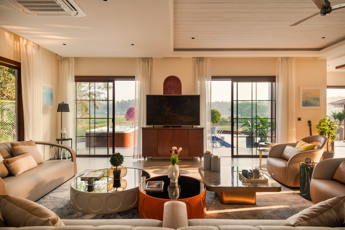 Vogue India-featured Mediterranean villa in Mandrem, North Goa with private pool, jacuzzi, and lush tropical gardens. Three ensuite bedrooms with designer interiors, open-plan living, full kitchen, and al fresco dining terrace. Steps from Mandrem and Ashwem beaches, yoga retreats, and beach shacks serving fresh Goan seafood. Smart TVs, high-speed WiFi, and 24-hour power backup. Ideal for families, couples, or groups seeking a luxury North Goa beachside villa retreat.