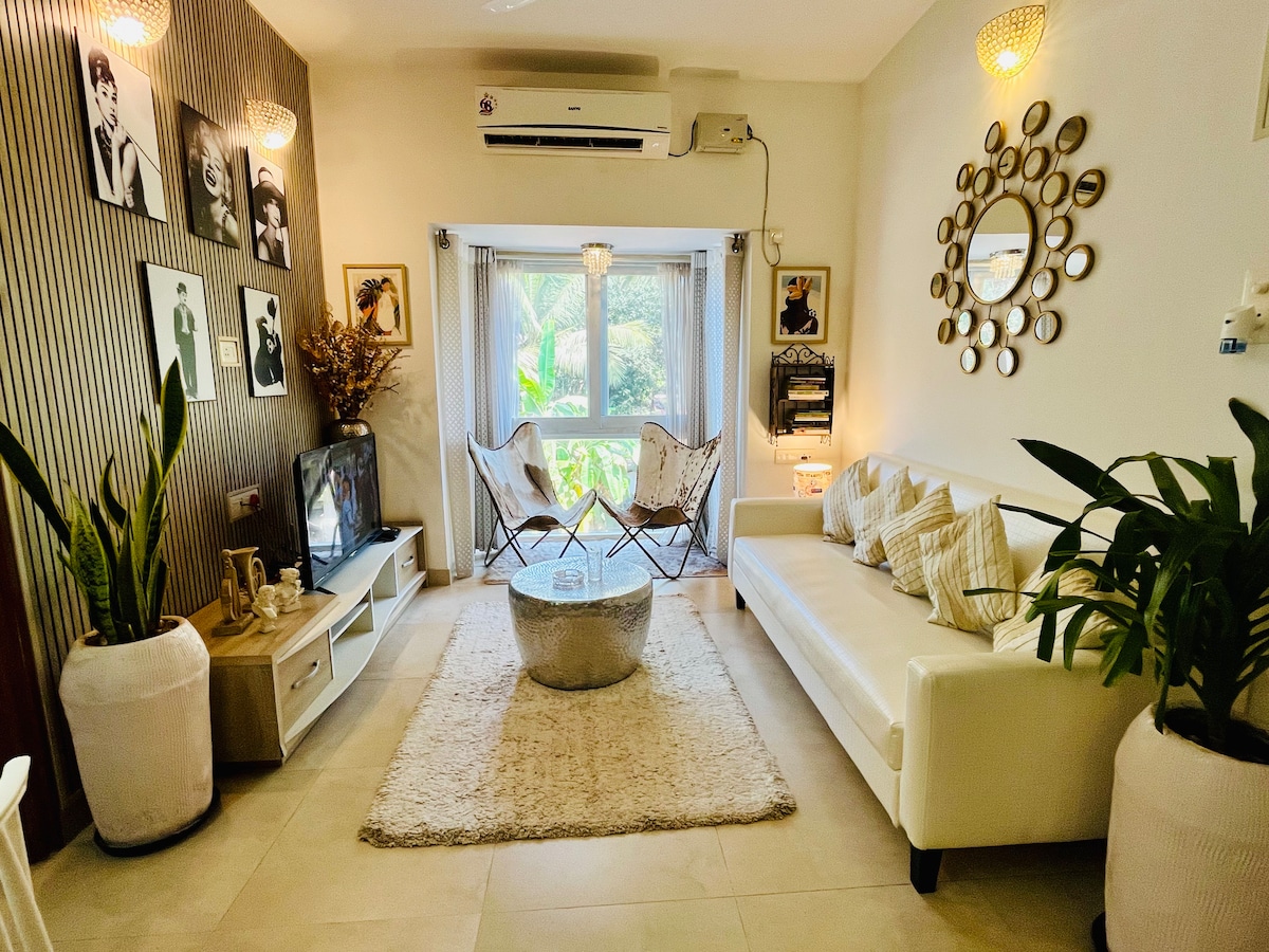 Modern Boho Apartment | Minutes from North Goa's Beaches.A cozy, fully furnished 1BHK retreat on ground floor perfect for couples, friends, or small families. Highlights: - Stylish Boho Interiors with a warm vibe - AC in bedroom & living room for comfort - Smart TV + High-speed WiFi - Equipped kitchen with RO water, cooktop, fridge & washing machine - Shared swimming pool (9 AM–6 PM | swimwear mandatory - On-site gym available at INR 200/-per person per day - 24/7 security - Free Parking