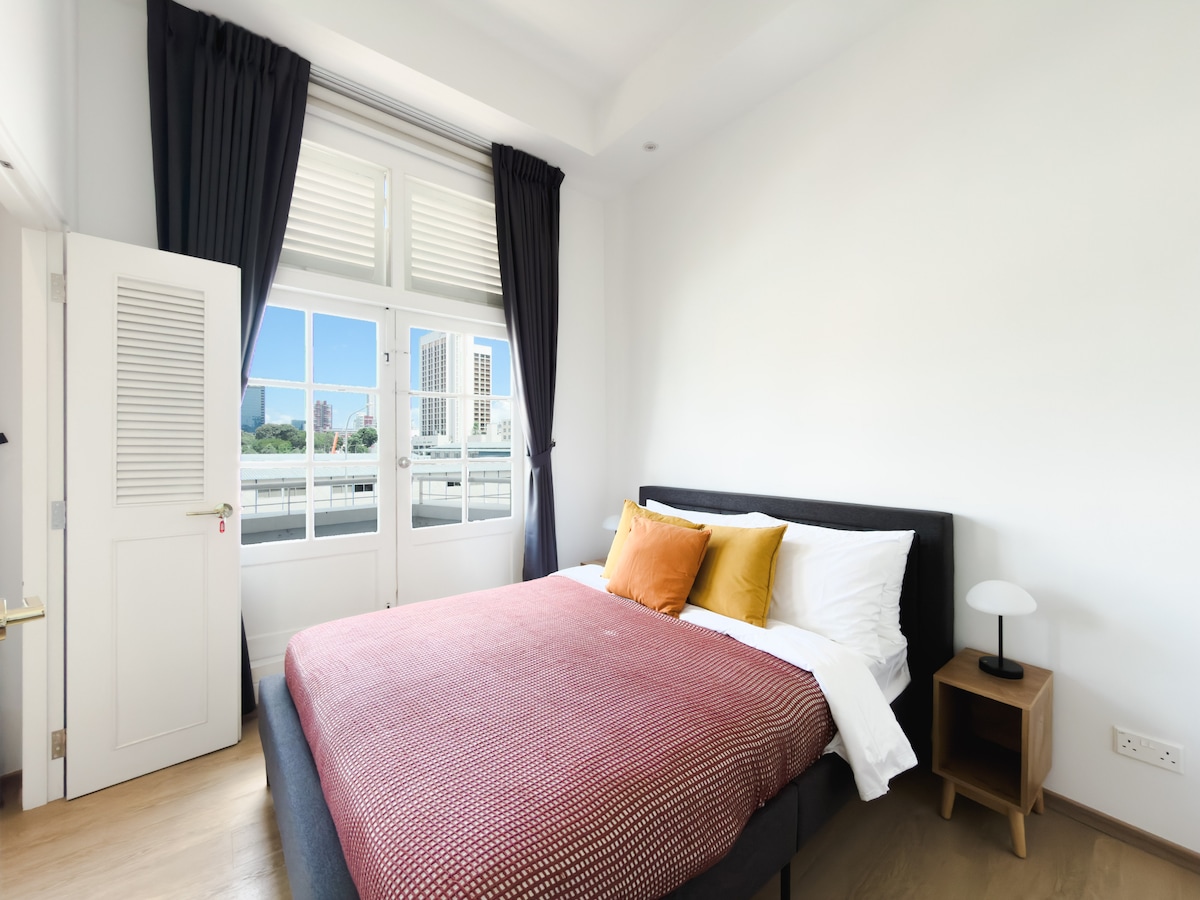 Our Premium Loft Plus has a unique layout that has a bedroom on an upper loft for added privacy. The high ceilings coupled with large windows create an airy and spacious feel in the apartment. Close proximity to landmarks such as CHIJMES, Suntec City, and Esplanade Food and grocery options are also only a stone’s throw away! Height clearance of the loft is 1.6m Apartment size: Approximately 190 sqft
