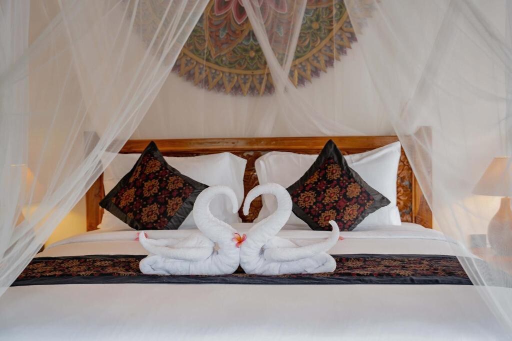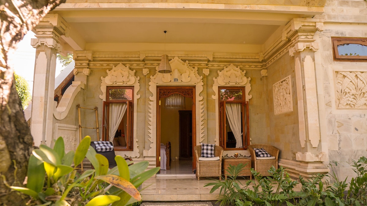 Immerse yourself in traditional design and comfort, complete with fresh linens and towels, A/C, and comfortable beds for a perfect night's sleep. Each room includes a cabinet and towel rack, as well as a private outdoor seating area for relaxation. Take a quick two-minute walk to the beach, where you can catch sight of playful dolphins, or dine at the delicious nearby restaurants and Warungs. Don't miss out on nearby attractions like breathtaking waterfalls and stunning temples.