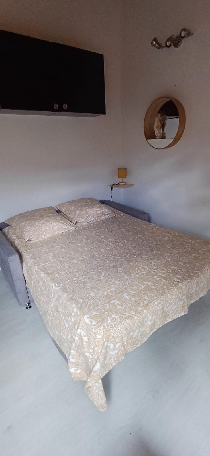 CHARMANT studio style cocooning classé 2 étoiles au 1 étg mansardé de 3 velux(rideau occultant) . entrée priv dans maison indv avec terrasse privée et terrain clos garage possible idéal pour 1 couple ou 1 pers +1 enf cuisine ,micro ondes ,four ,frigo , senseo, congél , raclette, grille pain, cafetière, bouilloire, fer a repasser , hôte, 3 gaz. espace de vie avec 1 lit 140x190 , 2 fauteuils +table repas 2 chaises ,TV, WIFI, radio ,s de b avec dche, wc, lavabo ,mobilier de jardin barbecue elec.