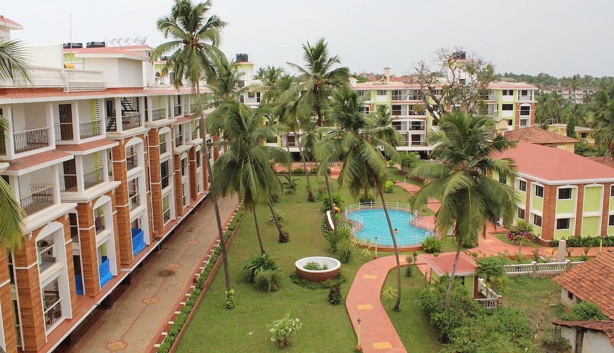 It's a perfect place to spend a great vacation in Goa. The apartment is located inside a gated residential residency called "Saldanha Palms 2" just 5 mins away from Candolim Beach. The place is a studio apartment located on the 1st floor with a fully functional Kitchen perfect for a small family and couples looking to have a comfortable stay. - Free and Safe Reserved Parking. - Swimming Pool - 5 mins walk to the beach - 5 mins walk to Delphino's supermart, restaurants, market area.