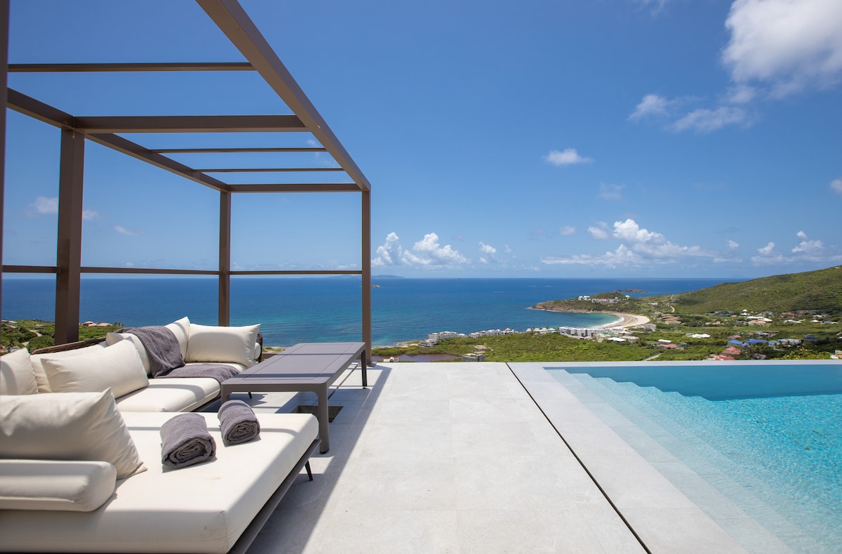 The Aman Oceanview is an oasis of calm, luxury and elegance, built into the hillside overlooking the sublime and sparkling Atlantic Ocean and Saint Barth. This a brand new modern property consists of two master bedrooms with two bathrooms, living room with fully equipped kitchen, exterior terrace and laundry area. All two bedrooms, the living room have unobstructed views of the ocean. A breathtaking infinity pool and a sundeck overlook the ocean, form the focal point of Aman