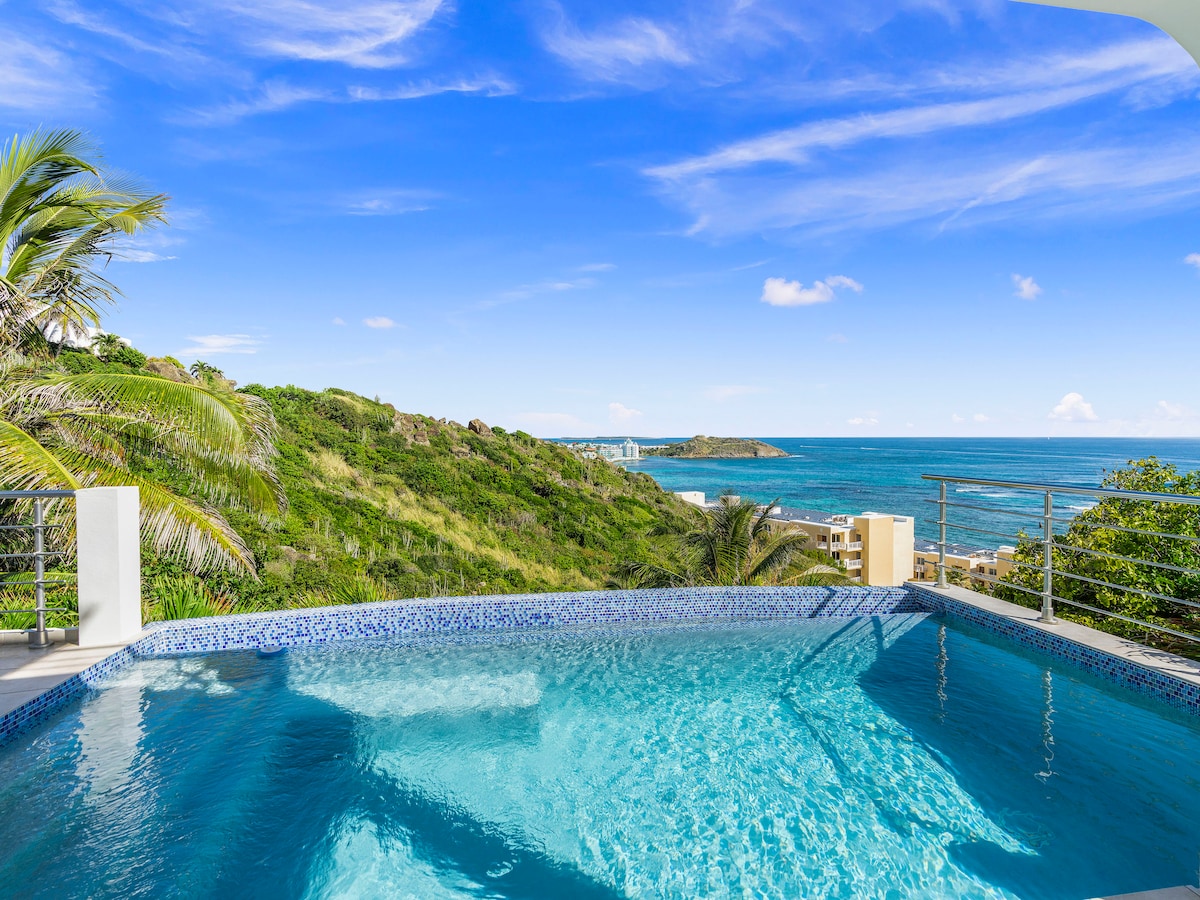 This luxury 2-bedroom, 2-bathroom apartment boasts breathtaking ocean views and a private expansive pool, offering a sense of serenity that’s unmatched. Largest pool in the neighborhood. Ocean views from shower! Thoughtfully managed by a top-tier host, every detail has been considered to ensure your stay is comfortable and unforgettable. Nestled near the beach and steps away from a chic beach bar, this place provides some of the island’s best views—an oasis of beauty in the heart of St Maarten.