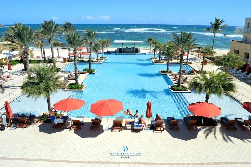 oceanfront condo overlooks Dawn Beach and the Atlantic Ocean. 3 bedroom, 2 bath approximately 1700 sq. ft. sleeps 8. infinity pool swim up bar BBQ grilling area Fitness center Balcony flat screen TVs Complimentary Wi-Fi Washer & dryer full kitchen with cookware, coffee machine, fridge, oven, cooktop, microwave, toaster, iron & ironing board. 3 bedrooms with king beds and a pull-out couch.
