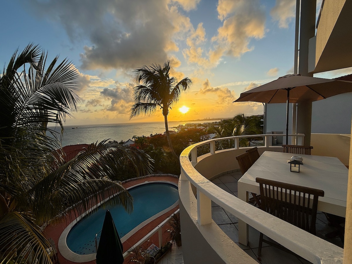 Wake up to the magnificent panoramic view of the lagoon on the top floor, rejuvenate your body with a refreshing dip in the private rooftop infinity pool with a coffee or tropical drink. Take a 10 mins stroll to the famous Mullet bay Beach and grab a few freshly French croissants by the Square. After sunset, enjoy the plentiful neighborhood bars and restaurants or take 5 mins drive to Maho where you will find a vast variety of restaurants, casino and clubs or Porto Cupecoy for romance spot.