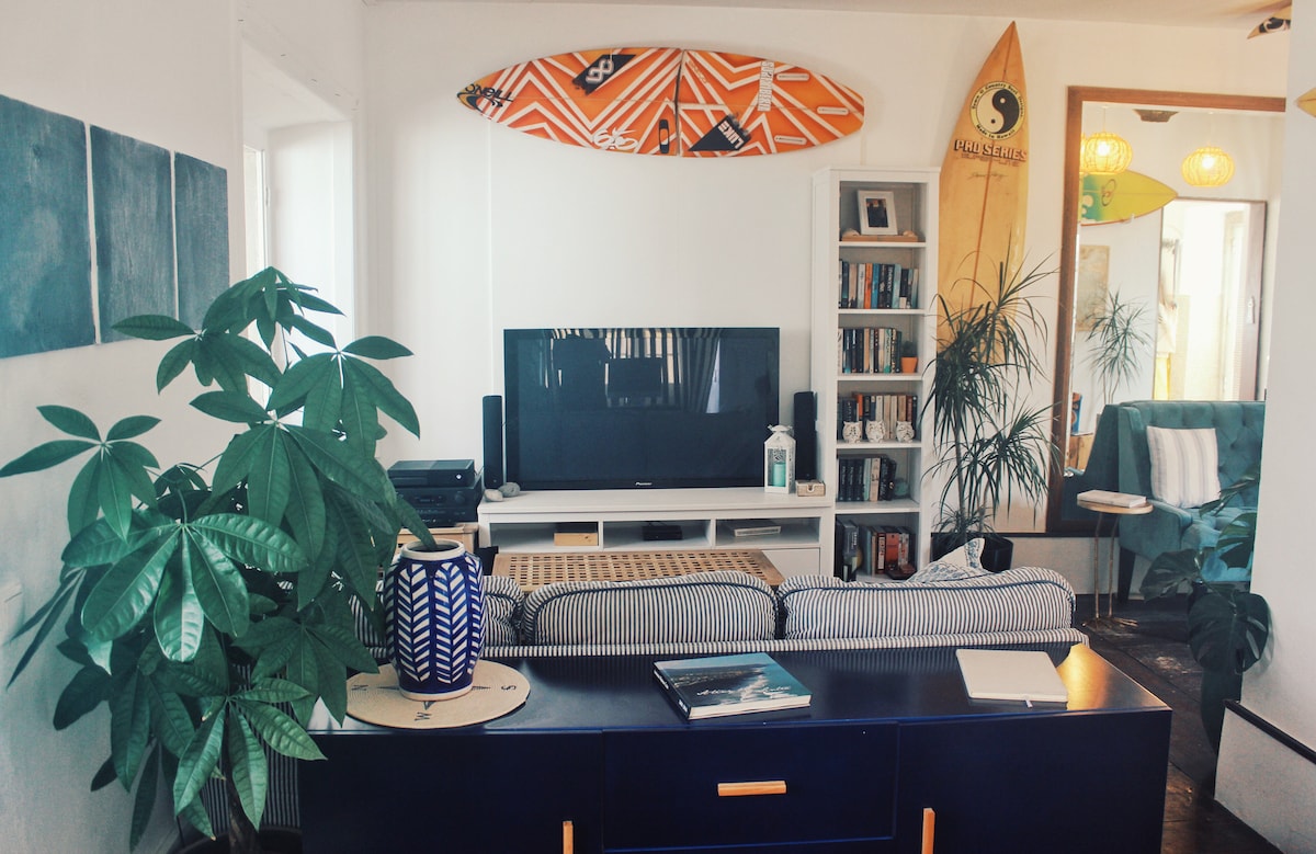 A private room in the Surfiberia Surf Lodge. This bedroom features a queensize bed, full length mirror, calm neutral tones with a pop of colour and rustic wooden floorboards. The bathroom displays authentic, carefully hand painted, Portuguese tiles that were original with the house. Perfectly located for quick roof terrace access, Fistral accommodates up to two guests. The kitchen and living space is shared with other guests.