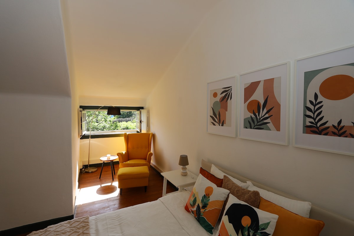 A suite in a farmhouse renovated for tourism, preserving the original charm of a traditional Sintra home, is ideally located near Sintra's attractions and amenities. It is perfect for couples, and solo travelers seeking a memorable and relaxed vacation. Surrounded by a tranquil garden setting, the house balances peaceful greenery with urban life. It offers a blend of rustic charm and modern comfort, featuring clean linen, a comfortable bed, and a garden view from every window.