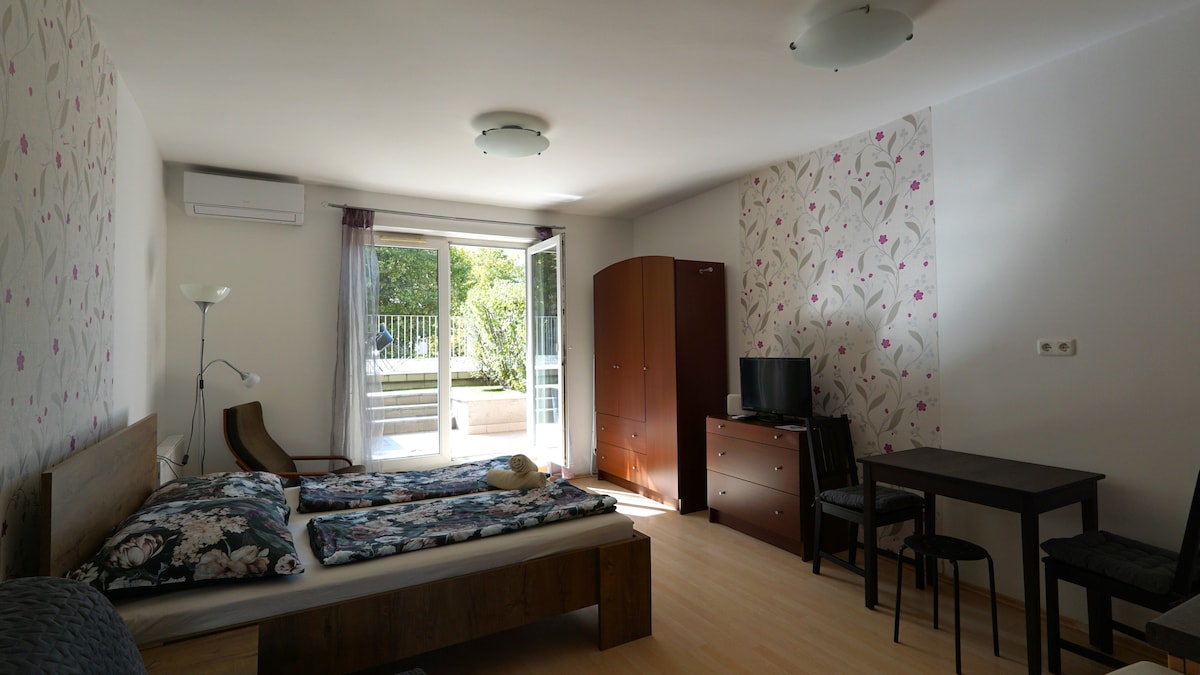 East-facing cosy studio apartment on the 3rd floor with elevator. Its terrace overlooks Lake Balaton directly. Two people can have a double bed. The apartment is equipped with shutters and mosquito nets. It’s a small apartment comfortable for two people. With a baby, possibly a small child (up to 4 years old), flexible couples will also have fun.