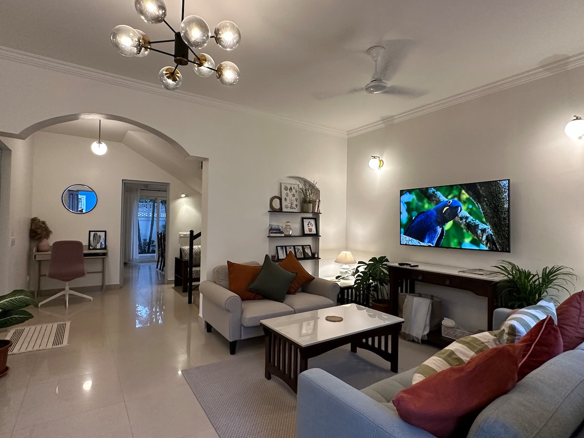 This designer home is a gem in the heart of Goa. Decorated with paintings collected from around India & contemporary furniture, this villa offers all the amenities you would need to spend a relaxing time with family or friends. The master bedroom, on the first floor, has a beautiful balcony where you can enjoy your tea/coffee or the sunset. You may also have butterflies and birds for company, thanks to the thoughtfully planted greenery that surrounds you. Surely a home away from home!