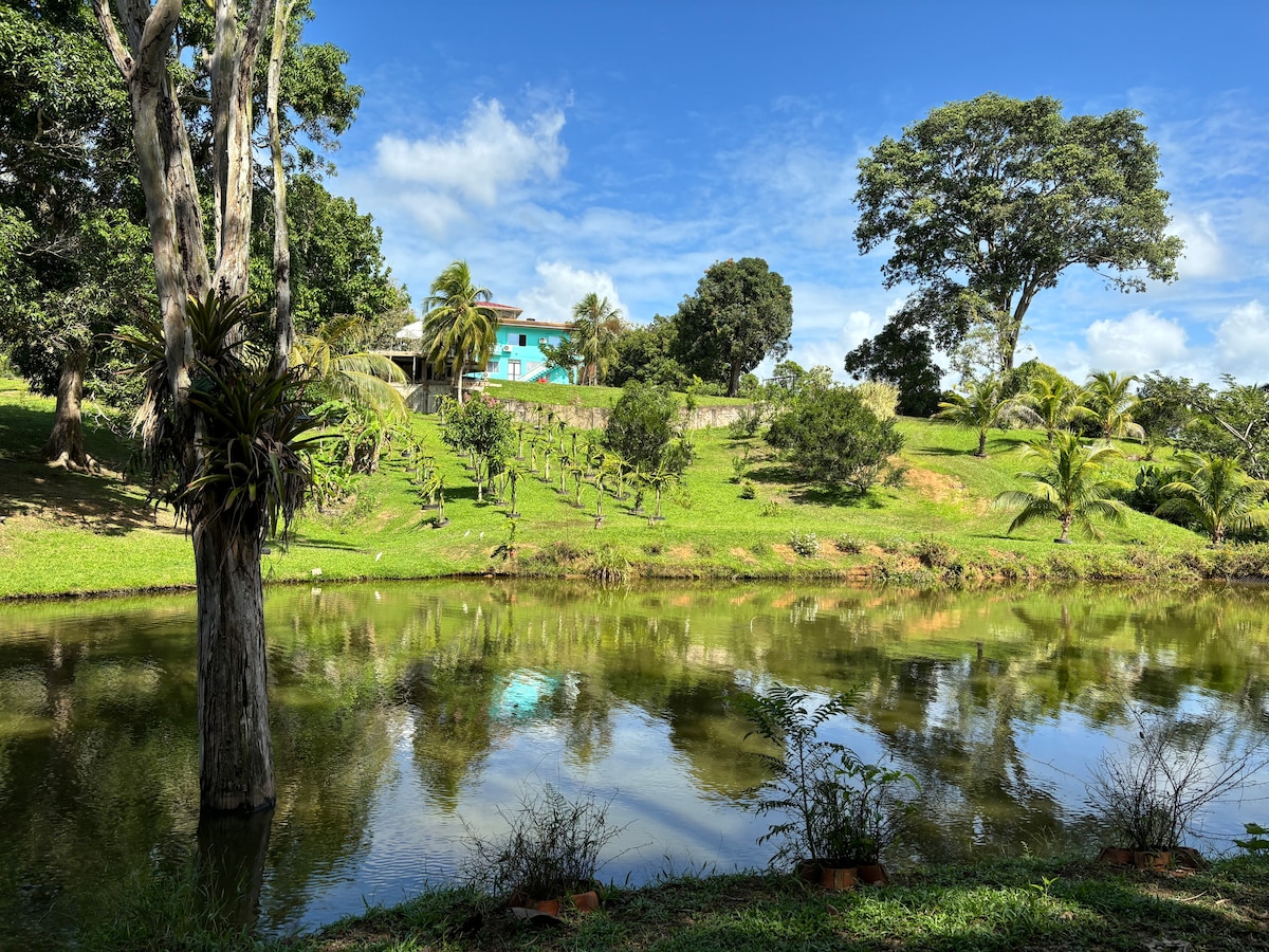 Set in the countryside of Trinidad, within the unique setting of an oilfield, we welcome you to our home. Our home is a seven bedroom villa on two levels. Guests will have private accommodation on the ground floor which comprise three bedrooms, one shower-room and toilet, a kitchenette, a library/sitting room/office, a utility space. There are also outdoor living and cooking areas. The home sits on 1/2 acre with mature gardens with fruit trees. The garden extends to a small farm to the rear.