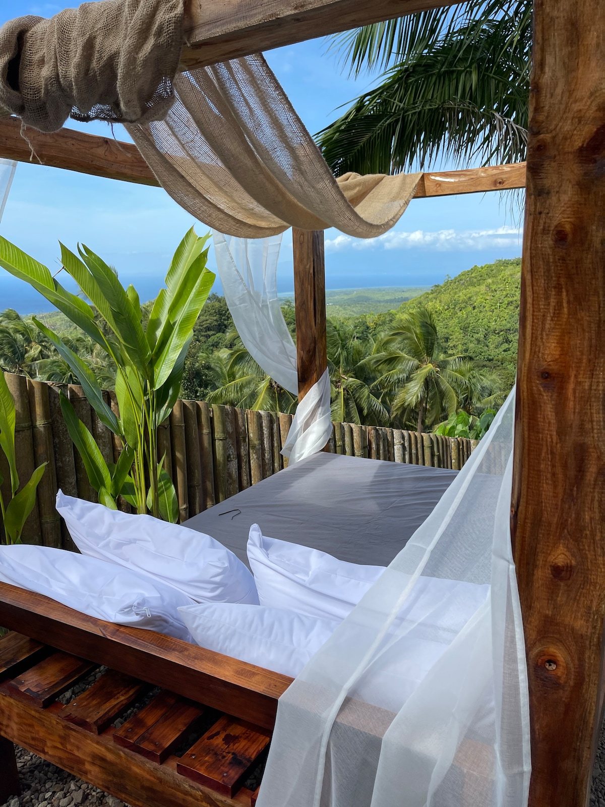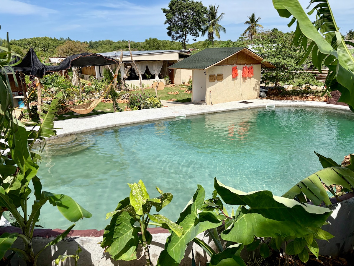 We are not on the beach or the main road. Paliton Beach is about 5 minutes away, and Siquijor Port is around 15 minutes by scooter or car, and parking is available. A ground-floor twin room with a beautiful mountain view from the balcony and a private tropic garden. includes two Full-Size Beds (1.5 × 2.0m each), ideal for families. The sheltered outdoor kitchen allows simple cooking and morning coffee. Guests enjoy Starlink Wi-Fi, solar-powered electricity, and our natural swimming pool.