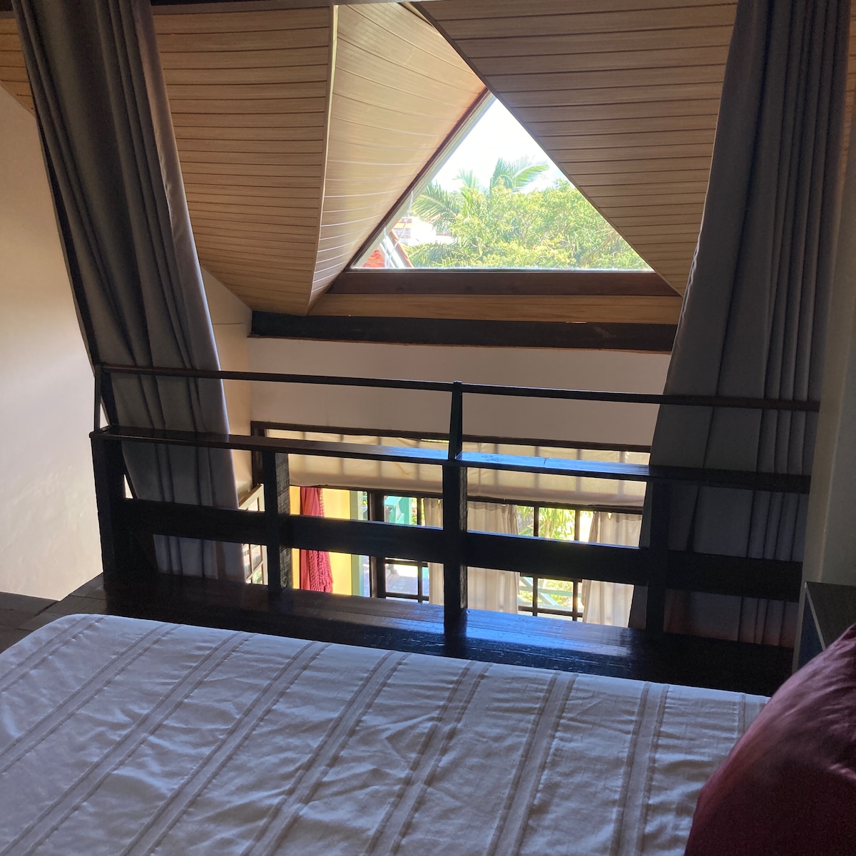 Essa acomodação no andar superior é decorada com muito carinho e cuidado e cada detalhe foi pensado para deixar sua estadia mais gostosa. É um espaço perfeito para quem está procurando um cantinho para curtir em meio à natureza e próximo ao mar. Possui janelas amplas com deck em frente. A área de banho é em conceito aberto, com uma cortina que a separa da área do quarto, sendo o sanitário é privativo. Disponibilizamos cadeiras de praia e guarda sol, além de toalhas para uso na praia.