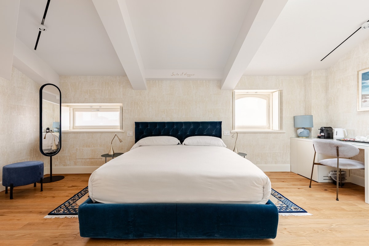 Vasca e doccia per un soggiorno sensoriale Nel cuore del centro storico di Verona, Suite Viaggio invita a rallentare e lasciarsi andare. Linee morbide, luce naturale e dettagli ricercati definiscono un’atmosfera intima ed elegante. Il bagno con vasca e doccia separate trasforma il soggiorno in un rituale di puro relax, mentre gli spazi comuni affacciati sulla città accompagnano i momenti di quiete.