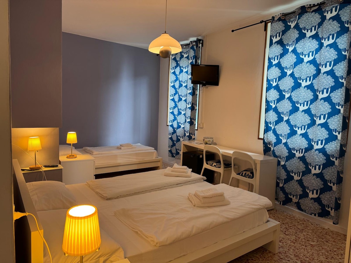 Camera Familiare. questo alloggio è pensato per ospitare fino a quattro ospiti. Famiglie, amici, coppie di amici. Su richiesta disponiamo di Culla per neonati. Gli animali domestici sono da accordare preventivamente. Parcheggi gratuiti e sorvegliati H24 nell'arco di 50/100 MT