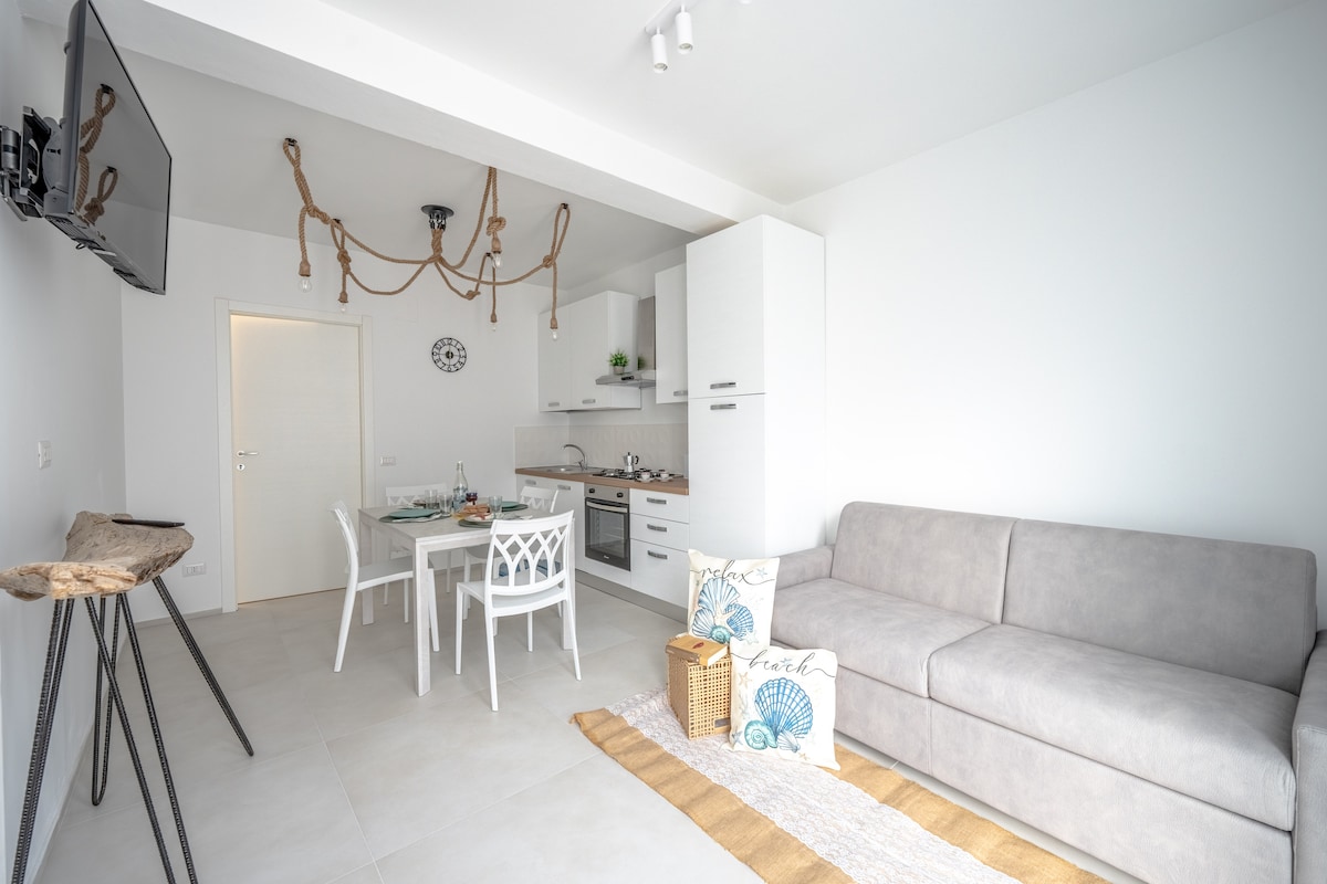 Accogliente appartamento di 40 m² con grande terrazza di 12 mq attrezzata per mangiare fuori e angolo relax, a soli 100 metri dalla spiaggia. Situato al primo piano di una piccola e graziosa palazzina in terza fila dal mare, questo appartamento rinnovato nel 2020 offre un ambiente tranquillo e silenzioso, ideale per una vacanza di relax. ZONA SENZA ZTL. Piccolo giardino condominiale. Posto auto al coperto incluso, ottima posizione pianeggiante e servita. A 500 mt. balneare CRAZY BEACH per cani