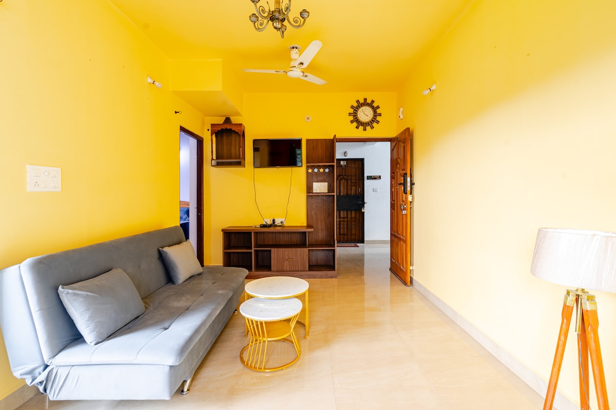 Certified by Goa Tourism 950 sq ft air-conditioned apartment: 2 bedrooms, 2 bathrooms, TV/living room, open kitchen; laundry nook + 500 sq ft non-air-conditioned space: dining for 4; sunroom sit-out; shaded patio; open-air balcony 300mbps internet; 4-5hr power backup; 50" Smart TV; books; board games; workstation & covered car park Located in Porvorim: 15min Panaji/Mapusa; 25min Calangute/Baga; 30 min Anjuna/Vagator; 45-60min Ashvem/Mandrem/Arambol; 60-75 min South Goa beaches; 120min Palolem
