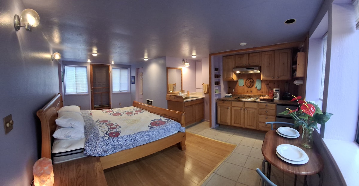 Your 14X14 separate furnished studio is pleasant, cozy & quiet. It is equipped w/ coffee pot, tea kettle, toaster oven, fresh linens, fluffy towels & a comfortable queen bed. Left of the residence & attached to the workshop your studio awaits your arrival. The park like setting patio has beautiful mountain views. The welcome book will be your guide to close by Siskiyou Lake activities w/ hiking, biking, golf & restaurants. It is 2 miles to town. Turn left up the driveway to your Cozy Studio.