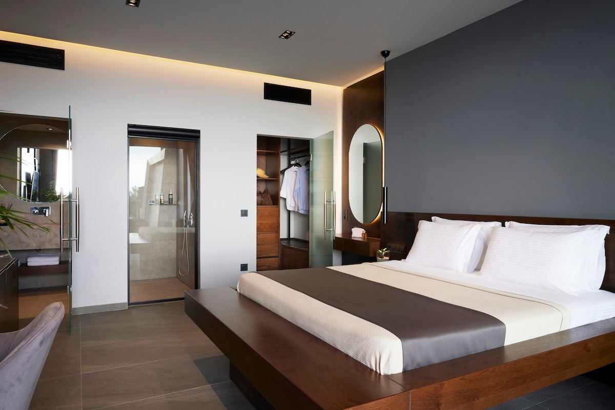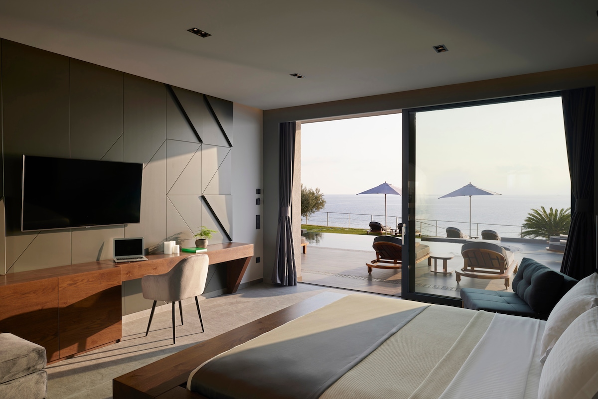 Brand-new development starting in July 2025 Experience refined luxury in this smart-designed duplex suite, perfect for up to four adults. The ground floor features a sophisticated living area with a double sofa bed (1.6 x 2 m), a fully equipped kitchen, and a stylish bathroom. A sleek staircase leads to the upper floor, where a spacious master bedroom, an elegant bathroom, and a private balcony await. Step outside to a 55m² private outdoor space, featuring a stunning private pool