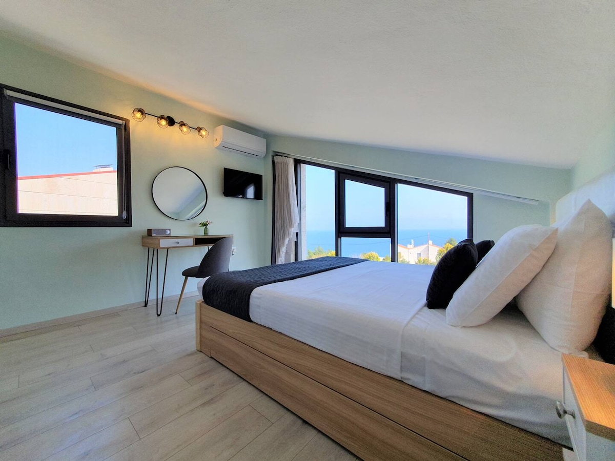 Enjoy your vacations in our renovated marvellous view appartment! Located at the side of a hill, overlooks the big blue of Chalkidiki and Mount Athos. Enjoy your vacations with your family or friends at this unique terrace, having a great BBQ, having breakfast or simply a glass of wine.