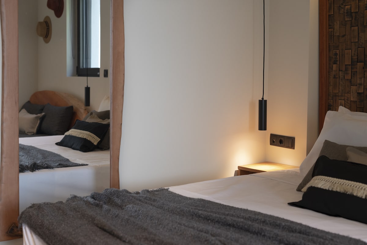 Α two story sanctuary overlooking the Sea. The master bedroom with a King size bed, features a freestanding bathtub and an en-suite bathroom with a soothing rain shower and double wash basins. Unique to this suite, a glass opening on the lower floor provides a view into the infinity pool above. Τwo bathrooms and a living room in earthy tones with a fully fitted kitchen, this suite offers a serene escape. Elevate your stay with having your breakfast in bed! | Suite size: 75 sq.m/808 sq.ft |