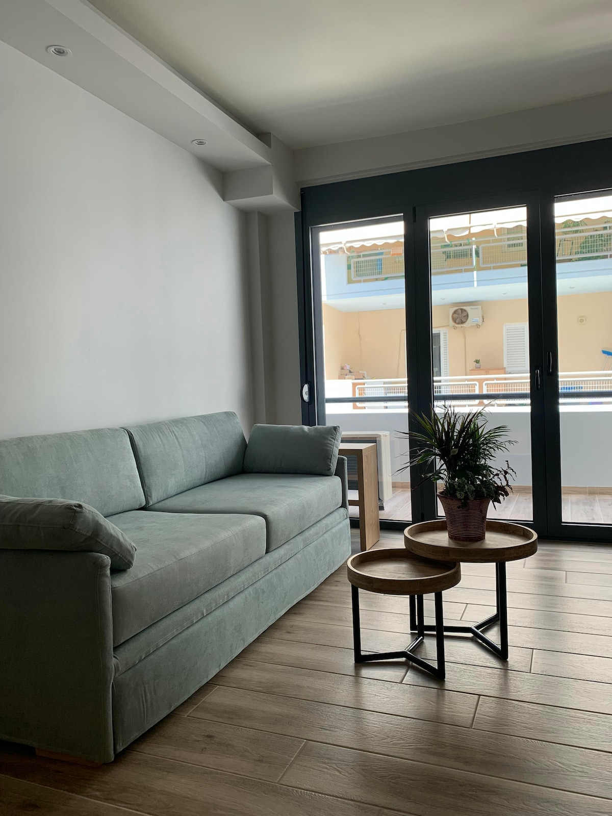 2 storey flat, recently renovated, stylishly decorated living room and bedroom with balcony, just 50 metres from the central square of Sitia, the port and nearby beaches surrounded by local cafes, shops and restaurants. Ideal for a couple but there is also a smaller bed available for a third person.