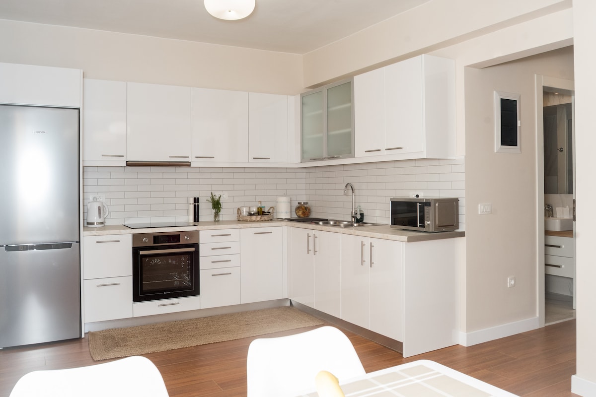 🌿 Evilion Home 1 – Your Place to Relax, Work & Enjoy! If you're seeking comfort, tranquility, and a touch of luxury, Evilion Home 1 is the perfect choice. Located on the 2nd floor of a private residential building, this modern apartment offers an ideal retreat for up to 3 adults or families with children over 12 years old. The space features warm, earthy tones and natural materials like wood and marble, creating a cozy and welcoming atmosphere.