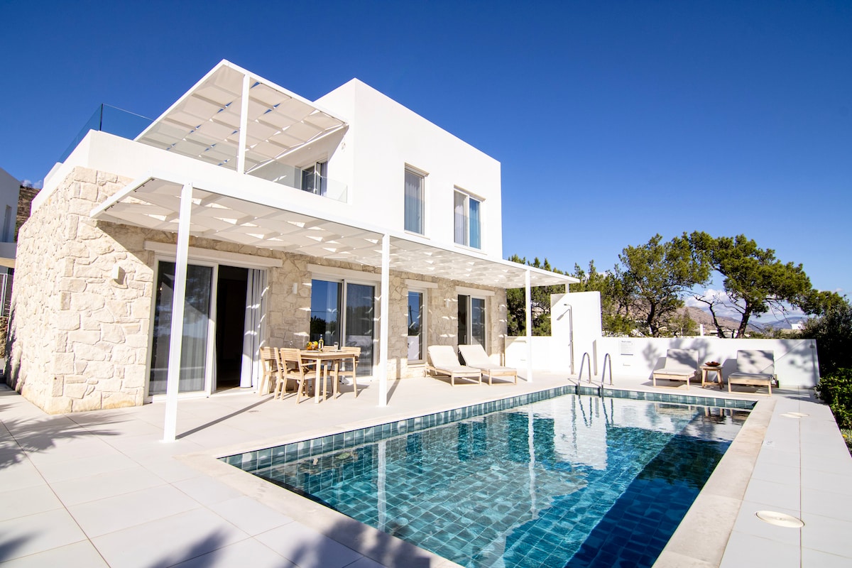 Welcome to your dream villa, built in contact with a rock formation! This residence offers two bedrooms with private en-suite bathrooms. (1 with extra sofa bed) The villa is situated on an 6000m2 plot filled with pine trees and olive groves. Several steps lead down to your secluded beach.The kitchen and the dining room in the aithrio feature panoramic sea views.The outdoor spaces of 120 m2 include a sitting area protected by a shading pergola,sun loungers an outdoor dining place,barbeque, shower
