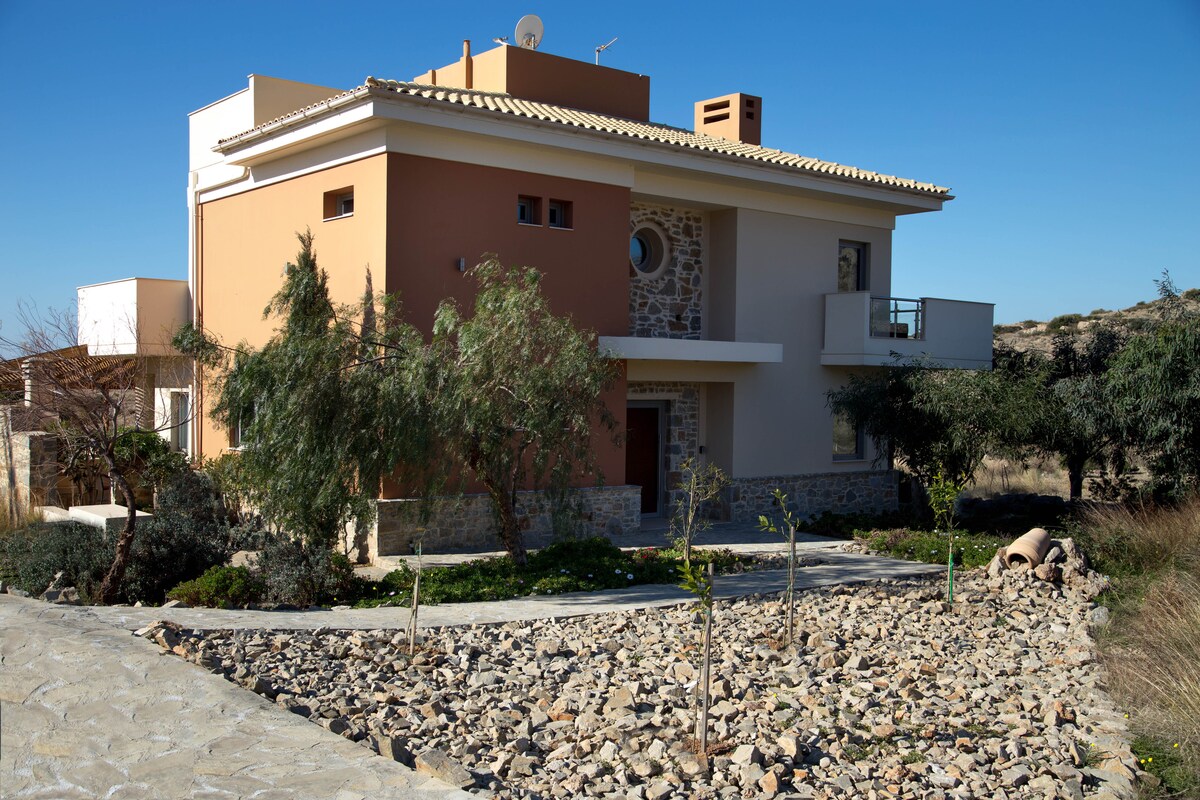 Welcome to your dream villa, built in contact with a rock formation! This residence offers two bedrooms with private en-suite bathrooms. (1 with extra sofa bed) The villa is situated on an 6000m2 plot filled with pine trees and olive groves. Several steps lead down to your secluded beach.The kitchen and the dining room in the aithrio feature panoramic sea views.The outdoor spaces of 120 m2 include a sitting area protected by a shading pergola,sun loungers an outdoor dining place,barbeque, shower