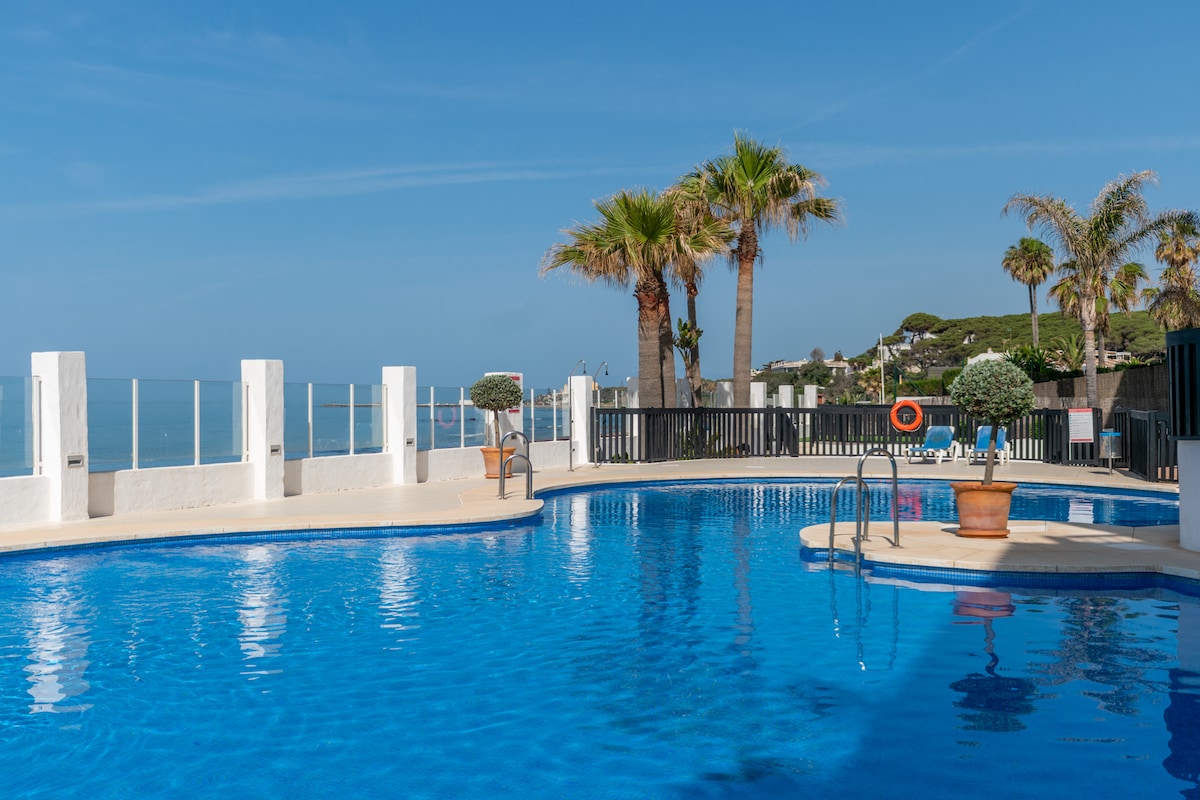 Cozy, bright, entirely renovated quality flat on the front line with sea views from the sunny and large balcony, both rooms and the bathroom. Features his and her shower, full kitchen, 2 tennis courts, 2 swimming pools (1 for children) large gardens, private beach area, free beach beds and private parking. We have a sandy beach with Blue Flag status and direct access to the sea boardwalk. Near Marbella and La Cala with 75+ restaurants and many shops walking distance. Strict cleaning protocols.