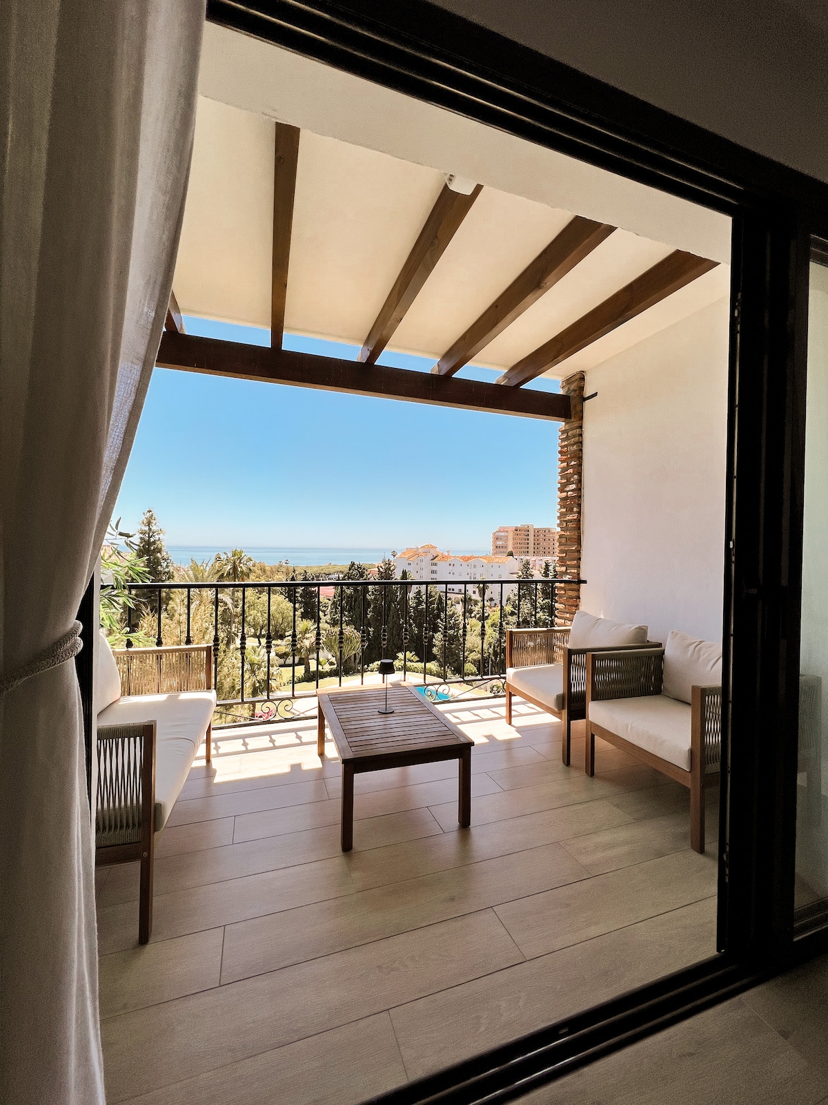 Our newest & luxurious apartment in Calahonda (Marbella). ✓ Fully renovated ✓ Suitable for 4 persons (134m2) ✓ 2 large bedrooms (1 with sea views) ✓ 2,5 bathrooms ✓ Fully equipped kitchen ✓ Modern living room with HD TV, Netflix and sound docking station ✓ Air conditioning/ heating ✓ WiFi ✓ Amazing balcony with dining and lounge set, a BBQ and two sun loungers ✓ Community with 3 pools with sun loungers ✓ Free parking in the underground garage ✓ A safe