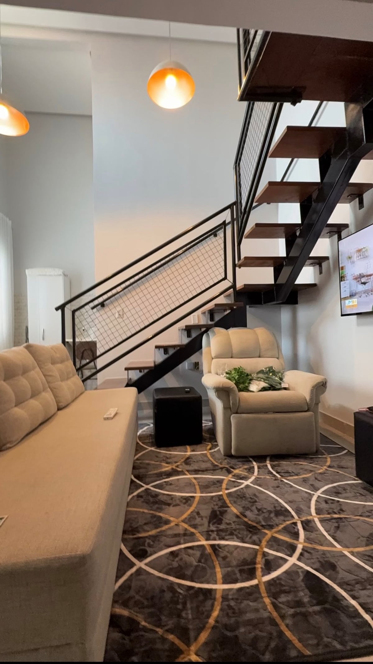 • Sala de estar integrada com TV e sofá super confortável. • Cozinha compacta e equipada para refeições. • Escada charmosa que leva ao mezanino, onde fica o quarto. • Wi-Fi • Quarto no andar superior com cama de casal, ar-condicionado, TV e mesa de trabalho — perfeito para descansar ou até fazer home office. • Banheiro prático com bancada de granito e espelho amplo. • Vaga de garagem disponível.