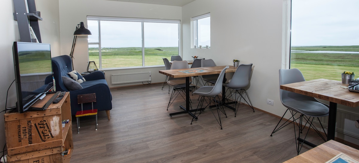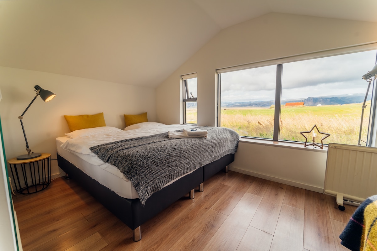 Hvammból Guesthouse is a small family run company. We rent out four studio apartments, which all have their own entrance, and a small porch where our guests can enjoy the beautiful view. Each apartment has a king size bed, a kitchen, coffee and tea, a bathroom and free WiFi. Bed linen and towels are provided. Dyrhólaey is only 5 minutes drive away, and other nature attractions, like The black sand beach, Mýrdalsjökull glacier and Skógafoss waterfall are only short distance away.