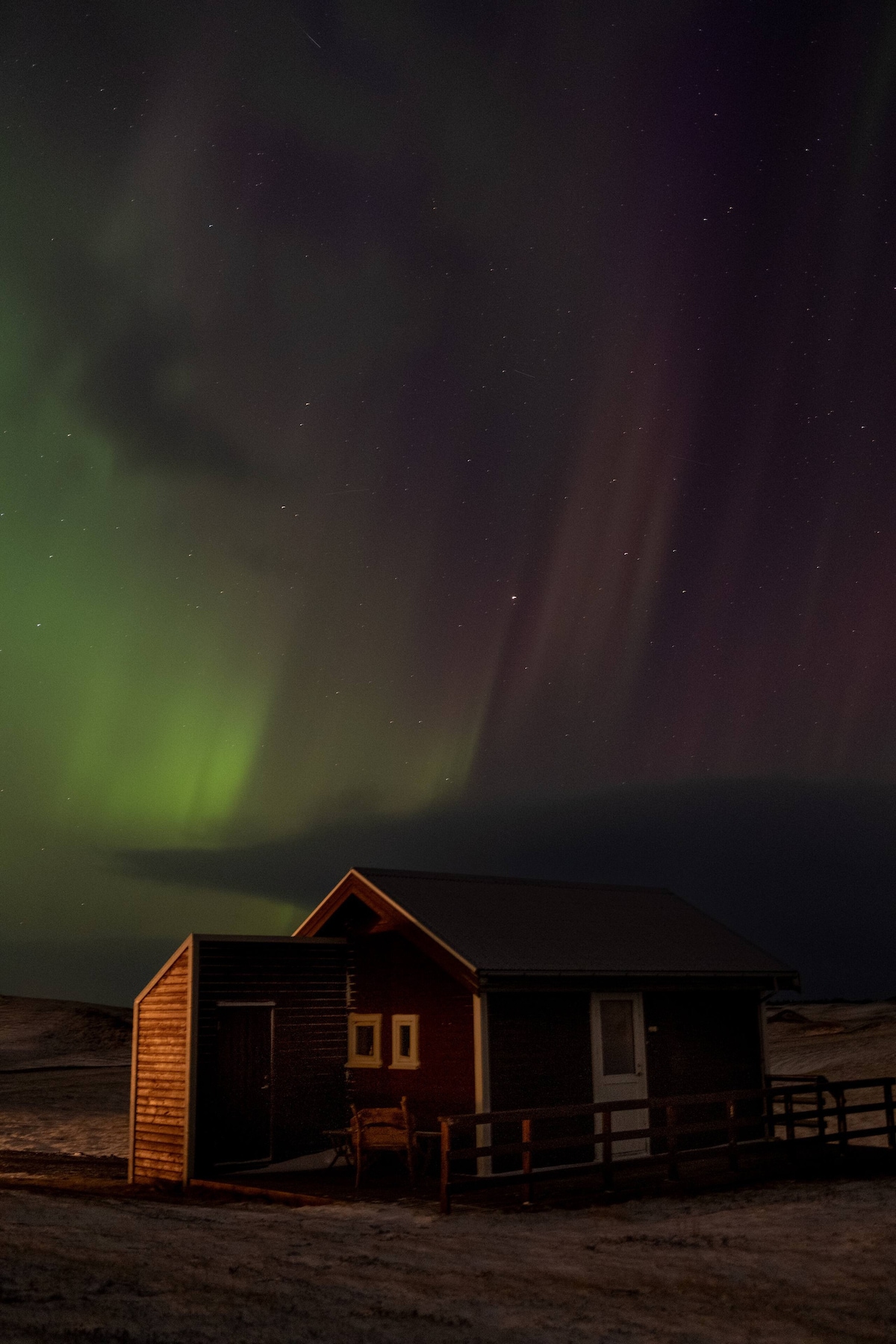 A beautiful very private cabin just about 1 Km. from the town of Kirkjubæjarklaustur. A perfect location to overnight on your way to the glacier lagoon or Fjaðrárgljúfur canyon. Our porch gives you a unique view of two glaciers Vatnajökull and Mýrdalsjökull. The view of northern lights is amazing from the porch in the winter time. The moss covered lava surroundings are rich with berries and birdlife in the summer time.