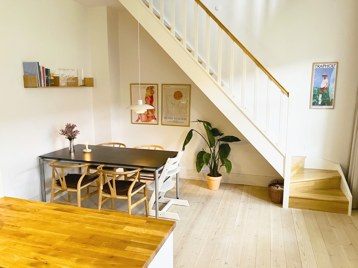 Your family will be close to everything: city, university, forest and beach. Trøjborg is an old and cozy district, which is popular to live in. The best place in the apartment is the balcony with a view of the forest, sea and Aarhus Ø. It is usually sheltered and perfect for sunbathing. The living- and dining room are one large room, so there is plenty of space for several people to be together. On the 1st floor we have 1 junior bed, 1 bed, 2 mattresses / a playroom and a workplace with a view.