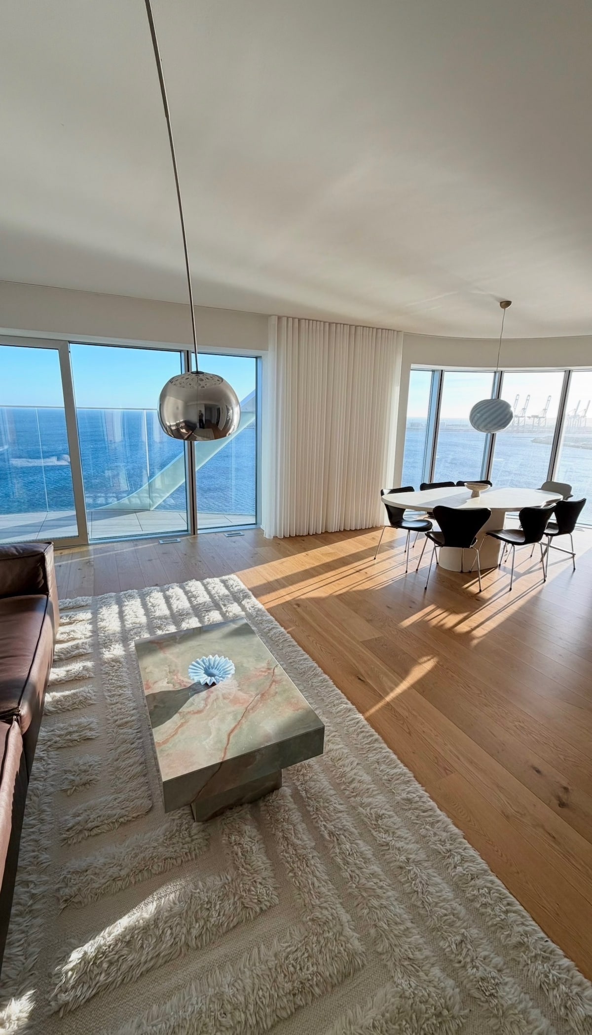 180 Degree Panoramic Ocean View House. Modern ocean view architecture by the Aarhus harbor front. Designed by the rewarded and world famous architect Bjarke Ingels featurering the best city harbor living and ocean views. The beach house is located with direct access to the outside, and offers beautiful views of the Ocean and Aarhus-harbor. The unit is featuring a modern two-floor open plan concept, with floor-ceiling glass doors and windows, allowing you amazing ocean, and sunrise views.
