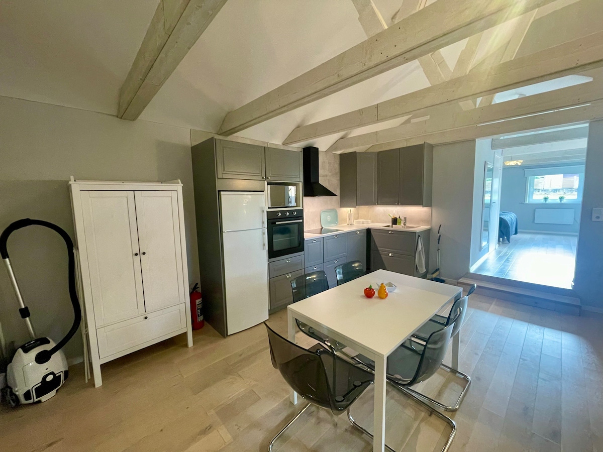 ”Känslan att nästan komma hem när man är borta” Detta boende har sin egna speciella stil. En del av ladugården ombyggd till en modern standard. Lägenheten erbjuder en MYCKET PRIVAT och ENSKILD vistelse med naturen utanför husknuten Inga djur på gården sen 1950-talet. Att komma med bil till lägenheten är att rekommendera.