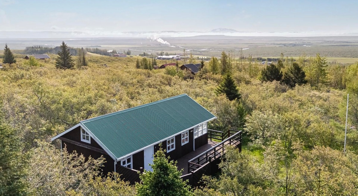 Spacious & cozy cabin on the Golden Circle. Sleeps 4 in beds & 4 on floor mattresses. If your looking for a good place to stay near the biggest tourist attractions in the south of Iceland like Geysir, Gullfoss & Þingvellir, this is the place for you. We have everything you are looking for, comfortable beds, spacious living room, fully equipped kitchen, flat screen TV, Apple TV incl. Netflix, fast WiFi, hot tub, SAUNA, outdoor fireplace, BBQ grill, central heating and amazing view over the south.