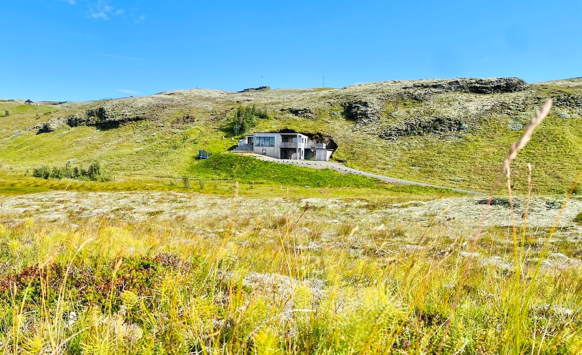 Sólfaxi is a modern luxury holiday villa in southern Iceland. It is a well-designed villa that makes the most of the stunning panorama view of its location. You can absorb and enjoy the mountain ranges and glaciers right from the living room and hot tub. It is right on the golden Circle, close to the major tourist attractions of the area, with the Faxi waterfall just a stone’s throw away. The distance from airport is about 1hr. 50 min.