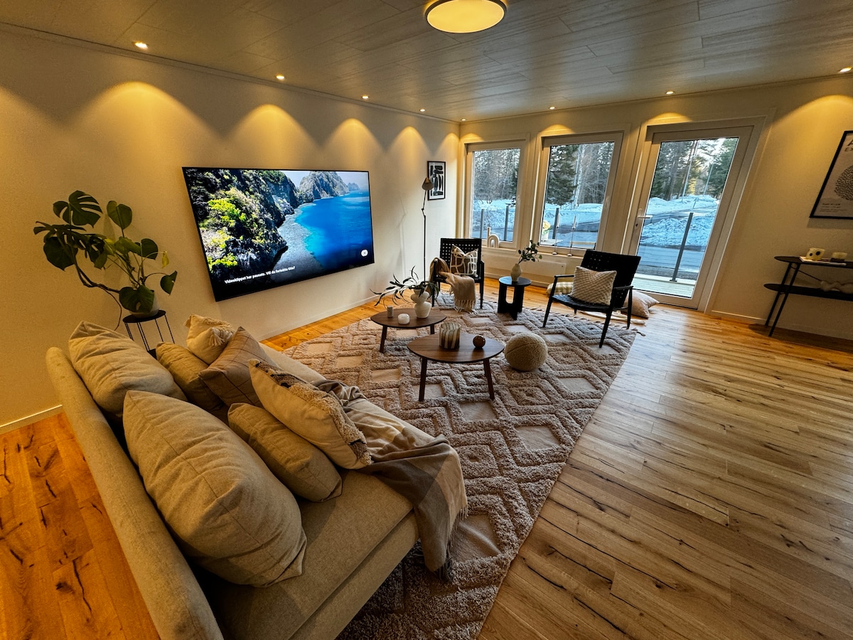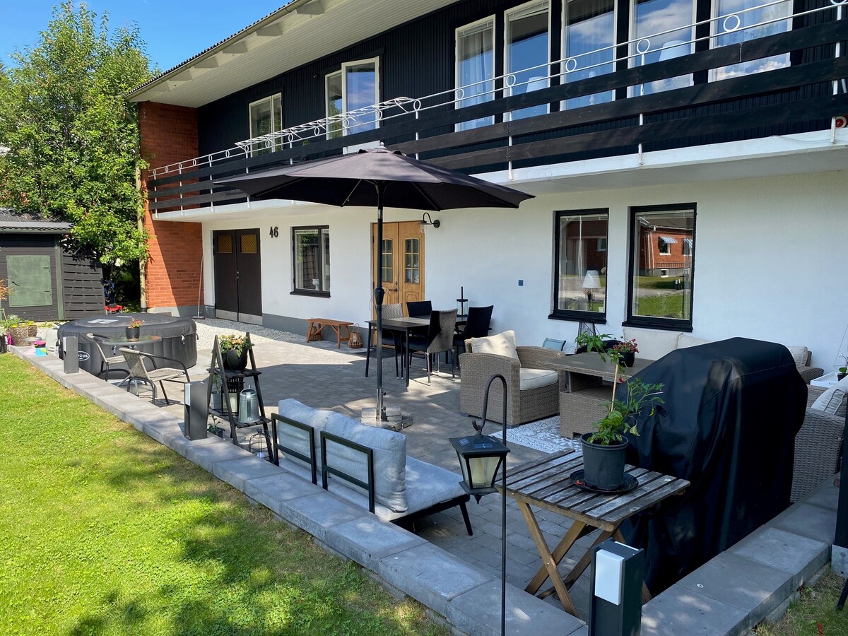Nära city. Nära badplats. Nära livsmedelsbutik. Nära konserthus. Öppen planlösning kök/matsal/vardagsrum med braskamin. Altaner med grillplats och spabad. Lugnt, naturskönt område med havsutsikt. Parkeringsplats med elbilsladdare. Tvättstuga med torktumlare. 1 sovrum (dubbel), 1 sovrum (dagbädd/dubbel), 1 sovrum 140 cm, 1 rum med bäddsoffa, TV i 3 rum.